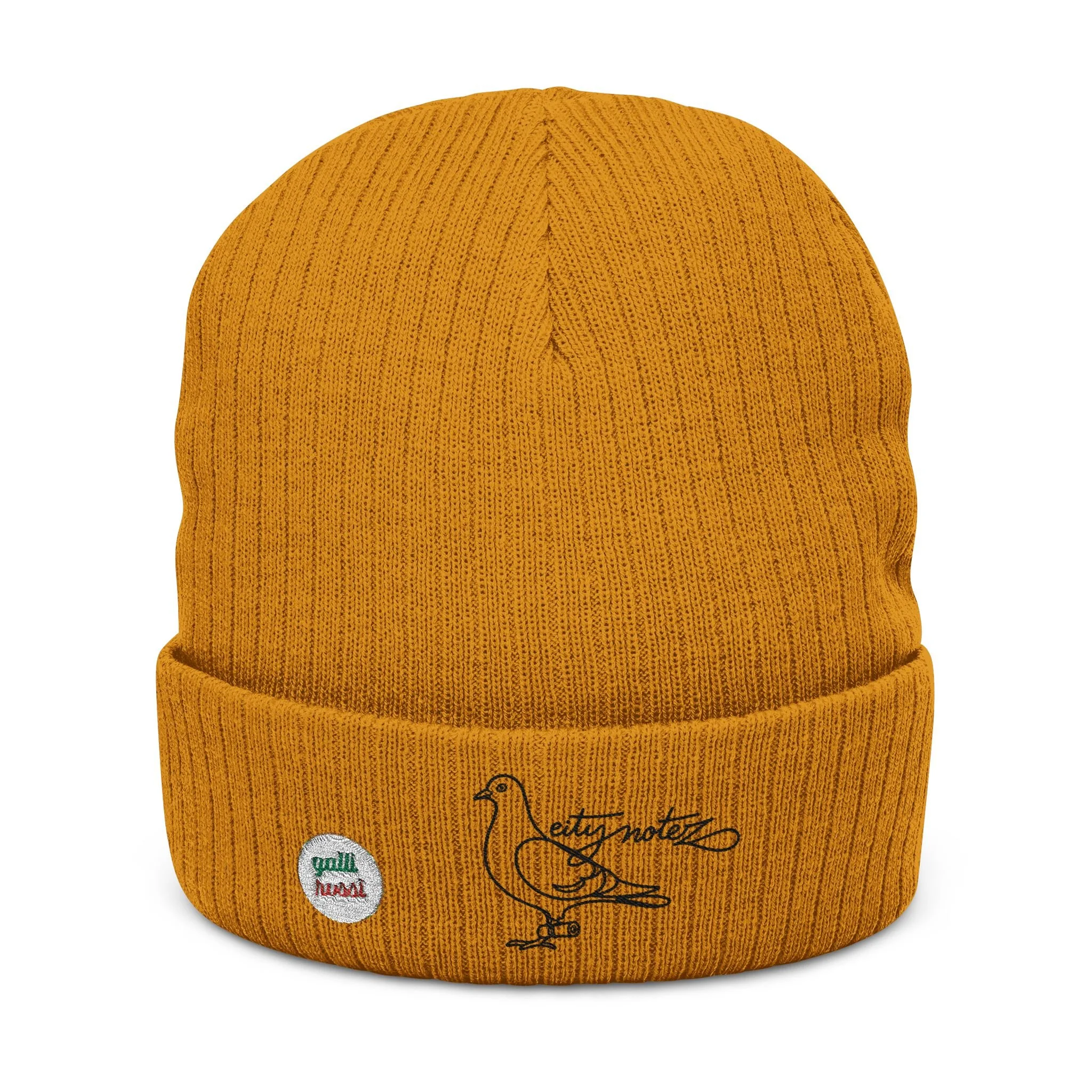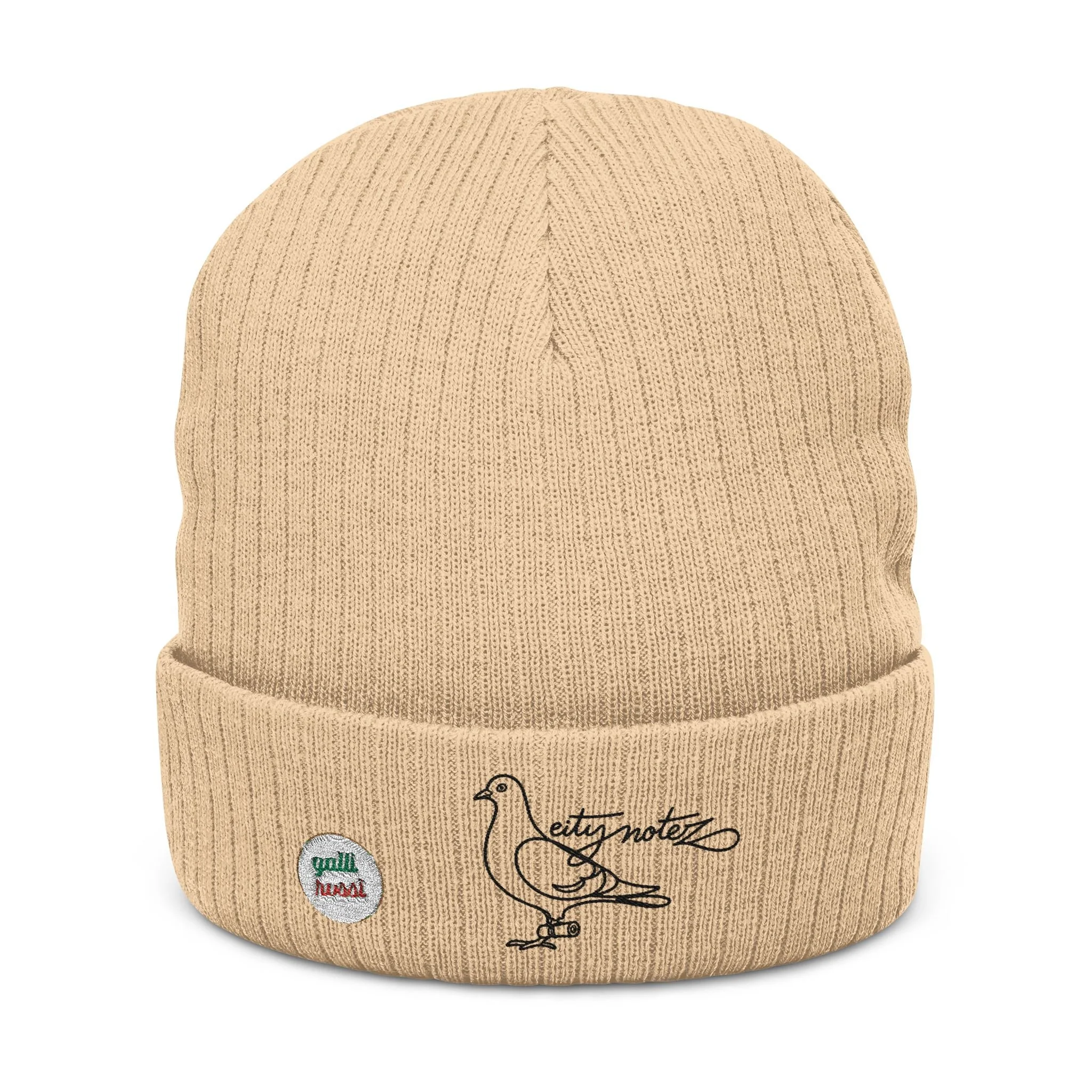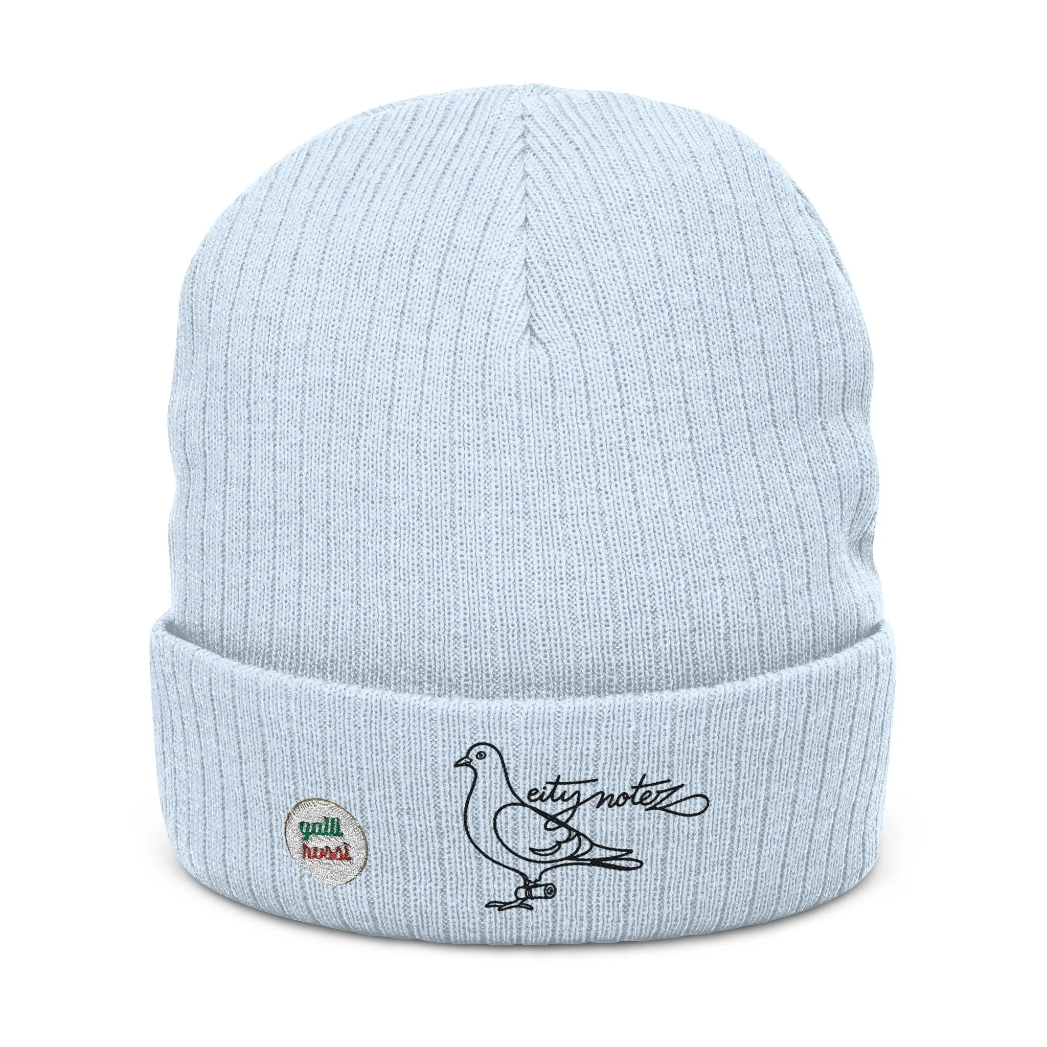 A soft, ribbed knit beanie stitched with subtle embroidery for everyday wear. The double-layer cuff traps warmth while the recycled polyester blend gives the hat a slightly structured drape and a cozy feel. The small embroidered pigeon motif and tiny patch add personality without shouting—this beanie slips on for city walks, coffee runs, or slow afternoons on a porch. It layers cleanly under a hood or over headphones and becomes the quiet finishing touch to relaxed, thoughtful outfits.